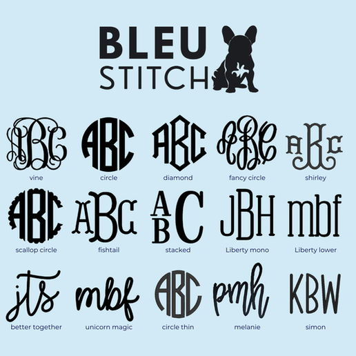 Bleu Stitch can source high-quality items in specific colors or you can ship us an item of your choice. Take a look below for our font, monogram, applique, and options to start your design.